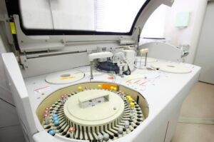 臨床検査科では、検体検査業務と生理機能検査業務を行います。検体検査は患者様から採取された血液検体や尿などを分析装置を用いて検査結果を医師に報告します。