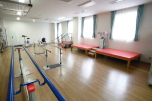 当科では、医師の指示のもと、理学療法士の指導による運動療法(筋力トレーニング、歩行練習など)や物理療法(牽引、温熱など)を受けることができます。脳卒中や骨折をはじめとして、様々な病気やけがにより、身体機能に少お外が生じ、日常生活を送ることに支障をきたす恐れがあります。その様な患者様に合わせてリハビリテーションプログラムを作成し、安全で効果的な治療を提供できるようスタッフ一同心がけております。