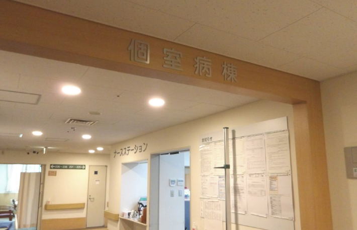 2階個室病棟は、入院した方のプライバシーが守られ、居心地良く過ごしていただけるよう、31床全室が個室となっております。キッチン、バス、トイレ付の20平米ほどの特別室も4室設けております。廊下は絨毯が敷かれているので、落ち着いた環境になっています。