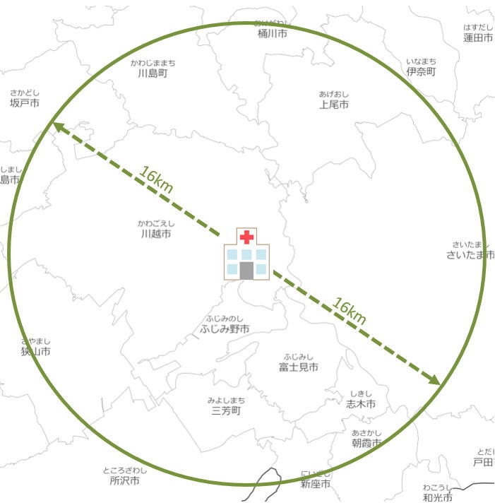 当院から片道16キロ圏内*が訪問可能エリアになります。