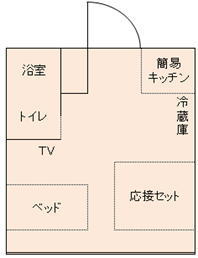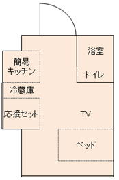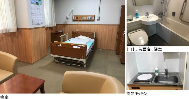 ワイドベッド、簡易キッチン、浴室、応接セット、トイレ、洗面台、TV、冷蔵庫、インターネット回線、病衣・タオル貸し出し
