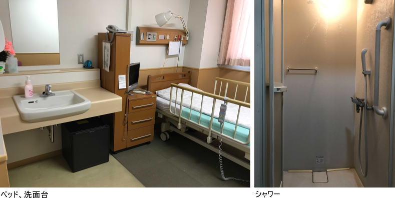 シャワー、トイレ、洗面台、TV、冷蔵庫、インターネット回線、病衣・タオル貸し出し