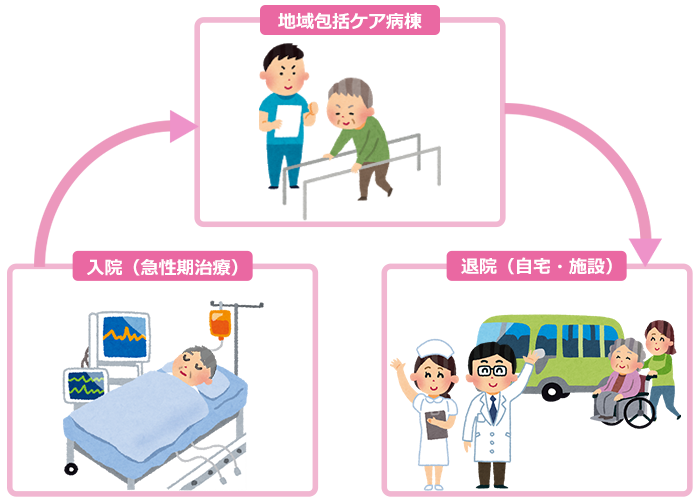 急性期(救急)の治療を終えて、症状が安定した患者さんには、早期に退院していただくことになっております。しかし、在宅や施設での生活に不安があり、もう少し入院を延長し、経過観察やリハビリテーションの継続をすることにより、患者さんが安心して退院できるようにお手伝いをさせていただくのが「地域包括ケア病床」です。 地域包括ケア病床では、在宅復帰支援計画に基づき、医師や看護師、リハビリテーションスタッフ、医療ソーシャルワーカー(相談員)などと協力して、在宅や施設復帰に向けてサポートさせていただきます。